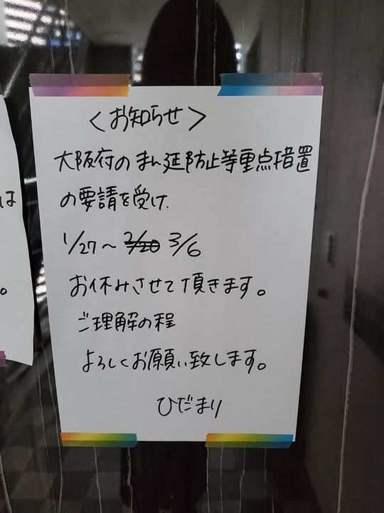 まん防の延長の要請を受け、ひだまりは3/6までお休みさせて頂きます💦