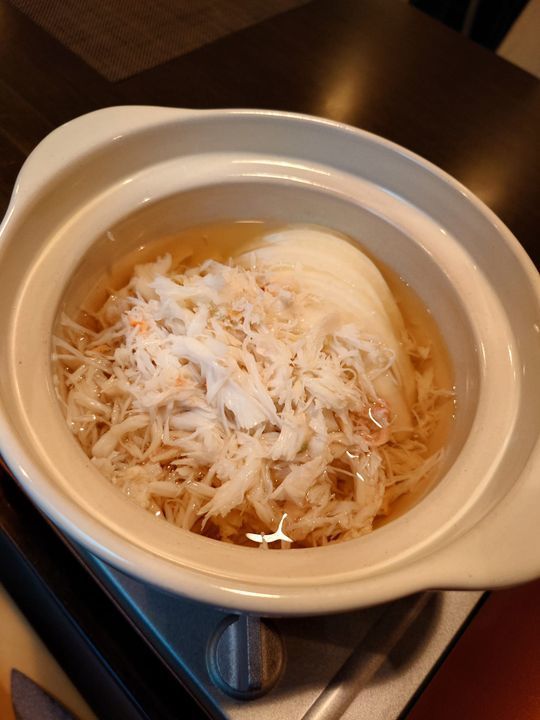 鴨と玉ねぎで出汁を作って、『蟹』『淡路島3年河豚』『近江牛三角バラとサクラかいわれ』をしゃぶしゃぶで🥢